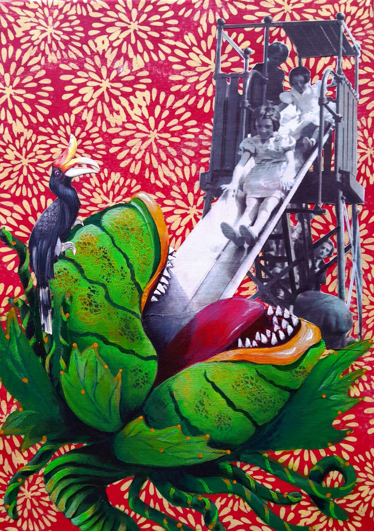 mixed media fruit bowl - gelli print, linocut and stencil print